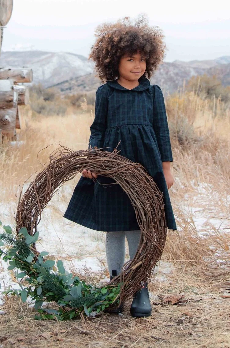 Classic Holiday dress, fitted dress with contrast black piping detail on collar. Gathered skirt hits at the knee for a great classic fit. Made with timeless Deep Green and Navy Tartan. Made of 100% Cotton
