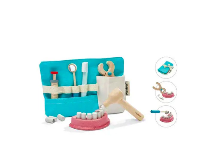 Pretend to be a real dentist! This set teaches children at a young age to understand the importance of tooth care. It includes 4 basic dental tools, 1 toothbrush, 1 set of teeth with 3 spare teeth, and 1 doctor case.